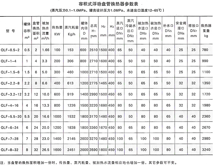 容積式浮動盤管換熱器的選用主要根據(jù)用水的流量,表中水流量指的是連續(xù)供水時的工況,當(dāng)間斷供水時,可適當(dāng)減少換熱器的型號。也可以根據(jù)用戶的工況和要求,在某種型號罐體的基礎(chǔ)上適當(dāng)加大或減少盤管的換熱面積。罐殼體積的承壓力一般為1.0Mpa,也可根據(jù)用戶的工況和要求,提高罐體的壓力等級。