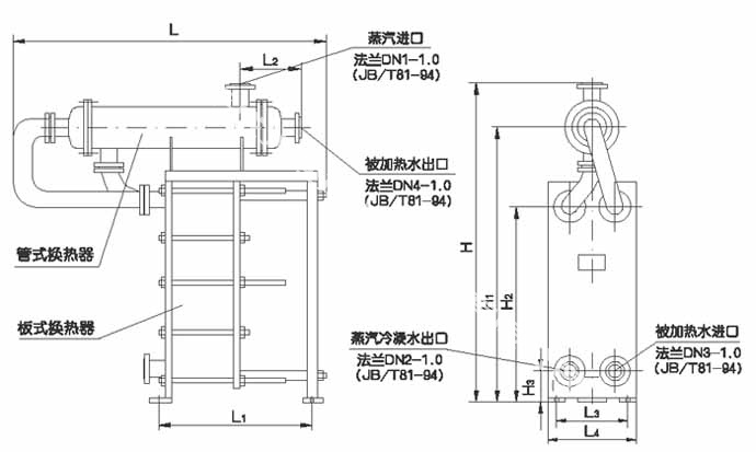 為了克服傳統(tǒng)板式換熱器使用溫度低的缺點(diǎn),當(dāng)熱側(cè)介質(zhì)為溫度超過密封墊片設(shè)計(jì)溫度的蒸汽時(shí),在板式換熱器基礎(chǔ)上加裝了降溫減壓裝置,叢而保證設(shè)備運(yùn)行平穩(wěn)可靠。為方便安裝與設(shè)計(jì),樣本中給定了汽一水換熱器外形尺寸,僅供參考。以下是比較典型的型號(hào),最終設(shè)計(jì)還需通過本公司技術(shù)部門的確認(rèn)。