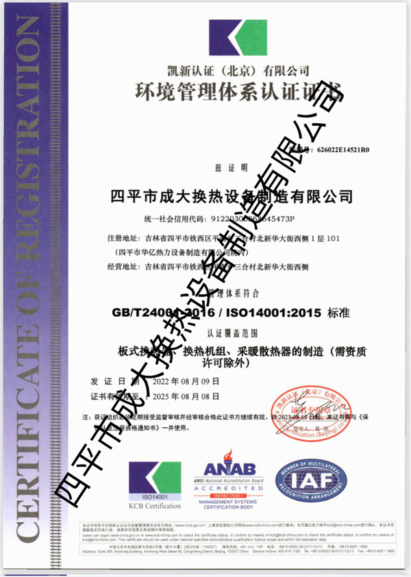 環(huán)境管理體系認證證書